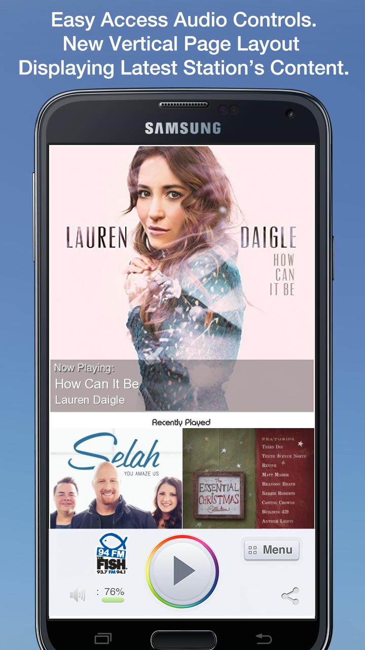 Whether at home, the office, shopping, or on the go, The Fish app gives you Contemporary Christian Music from today's top artists - like Chris Tomlin, MercyMe, Casting Crowns, Francesca Battistelli, Mandisa, and many more! Set the alarm on the app to start your day with the Morning Team - then be encouraged and uplifted all day long with music that's Safe For The Whole Family!