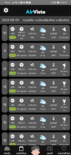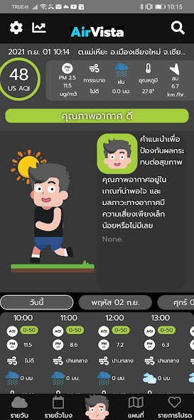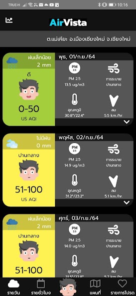 AirVista is an application to report and forecast air quality, based on the results of the Weather Quality WRF-SEM, which is a real time prediction (Realtime) in advance of 3-5 days, with a maximum of 4 km. Can be used for access to air quality information and other related information in areas that do not have a measuring tool or a few AirVista quality reports. But also the report of air forecasting information that affects the relevant air quality, such as rainfall, wind, temperature and ventilation index In addition, this application also reports dust measuring PM2.5, ground and heat point information, expected to be caused by the fire that the satellite has detected to check the air quality situation. At present, AirVista gives advice on reducing health risks to the public to protect themselves from air pollution. And offers the necessary information for the authority to make a decision to control and prevent air pollution. However, the model system is undergoing research and development. Which users should use under these limitations