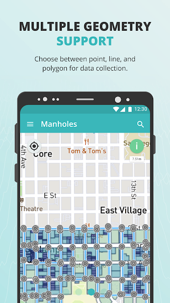 Choose between point, line, and polygon for data collection. Whether you are mapping POIs, pipes or even doing a cadaster, you are covered.