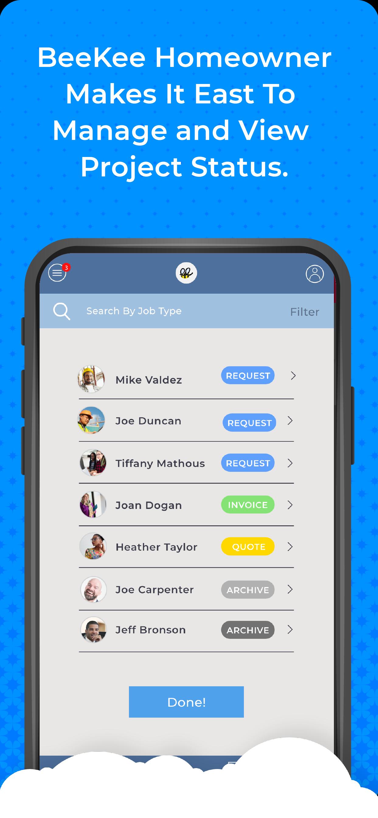 With BeeKee, it's easy to communicate your needs with several different professionals no matter how many projects you have going on. BeeKee Home provides real-time communication through all forms of digital communication. What's more, BeeKee makes it simple to track and stay organized, with the ability to keep records of everything you’ve done to your home directly through the app.