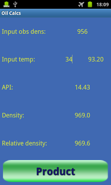 The app can calculate for crude oil, black and white products and lubrication oils, and input can be changed between density in vacuum / API, M3 and Barrels, and degrees Celsius / Fahrenheit.