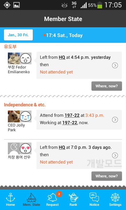 You can see where your staffs are and what they do in one screen. checman lets you know the updated information in real time without refreshing when staffs' status is changed. Not only checking out the time and places but also guessing their feeling with their emoticons. Tab the date button when you want to know staffs' record in the past time. The stacked data one by one from the day of starting checman becomes their business log day after day. You can also see the individual detail monthly record in timeline format when you tab some staff. You can request their location information in real time after simple setting up.