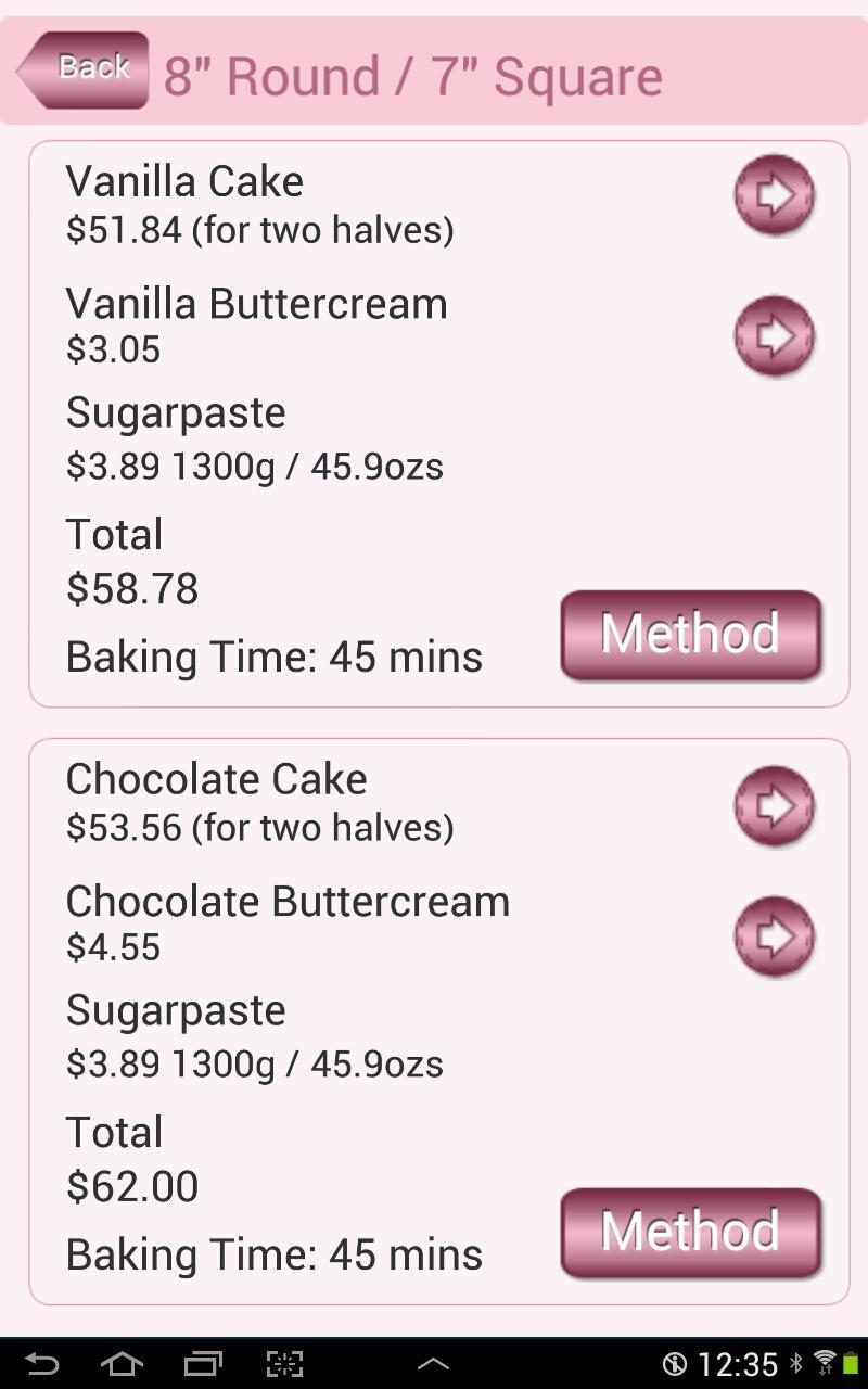 The recipe has been broken down so that you can choose the size of tin that you are baking for. Check the "Update Ingredient Prices" section and add in the latest prices for your ingredients, and it will automatically work out all the costs for the cake and the buttercream in all sizes from 6" - 13" round to 5" to 12" square.