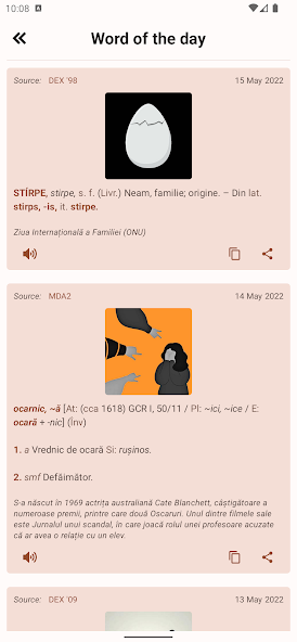 dexmobile (dex mobile) - the application for Android allows you to search for the definitions of a certain Romanian word. It also includes the list of words of the day from dexonline.ro. It allows sharing definitions and marking them. It also works without an active internet connection using offline mode.