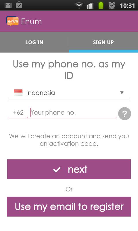 You don’t need to register. Enum uses your phone number as your identity and lets you make free phone calls to any of Enum users using their phone numbers. Enum even automatically shows you who from your address book already has Enum . It's that simple.