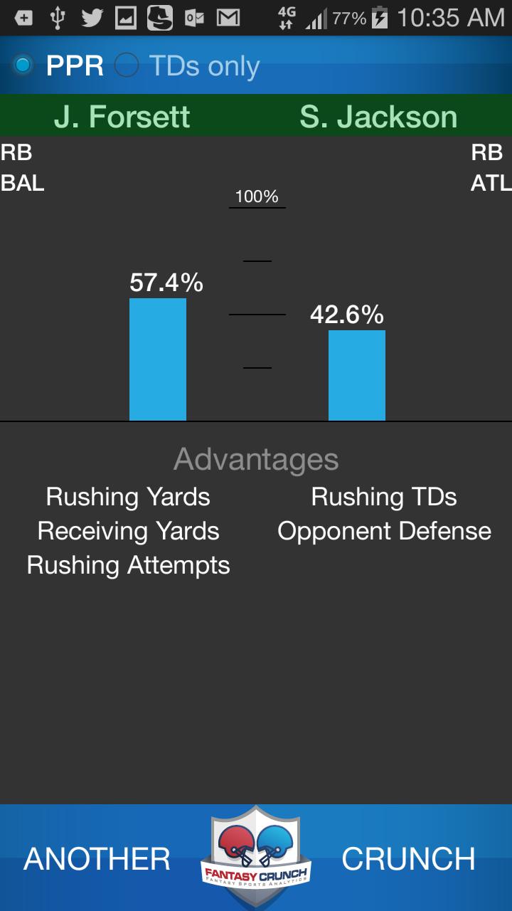 March your fantasy football team to the endzone by using real data. Before you set your line-up, are you looking at targets, yards, receptions and opposing defenses? So is Fantasy Crunch, but we take to another level and we do so in seconds and you have the ability to switch from Standard and PPR scoring systems. Not only are we looking at the more common variables that impact your start/sit decisions, but we also look at offensive tendencies to run or pass ,redzone targets and attempts, along with several other factors that impact a players performance.