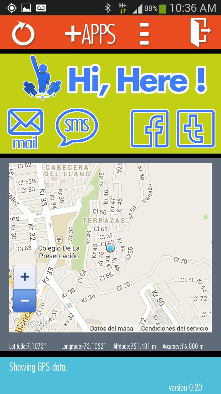Hi Here, I am here - is an easy to use App, allowing you to share and report your current location using a friendly interface, indicating the address or the street where you are. The App use the GPS service provided by your smartphone and show where you are on the map and also in terms of coordinates of length , Latitude and Altitude with a precision factor determined by the quality of your GPS device. It is as simple as saying "I am here"!.