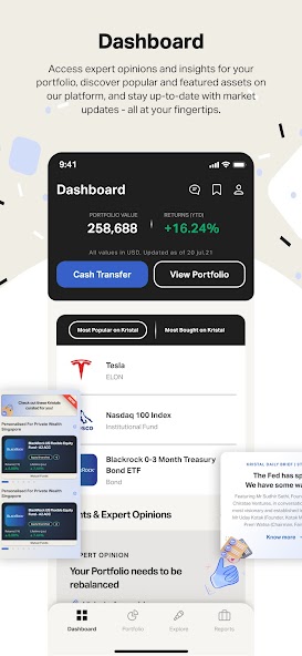 For everyday investors, we have 200+ ETFs curated to sector themes, and algorithm-managed portfolios. The portfolios will be automatically rebalanced to help you get started with ease. With the Kristal.AI mobile app, you get your portfolio dashboard, market updates, and latest investment opportunities on-the-go.