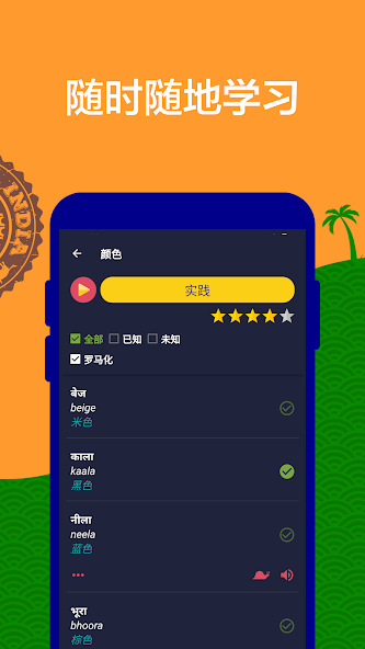 In addition to studying a large and diverse selection of Hindi words, you can also practice your listening, reading, and writing skills in the most interesting way! In each test, you can select which activities you want to perform, based on your knowledge of the category.
