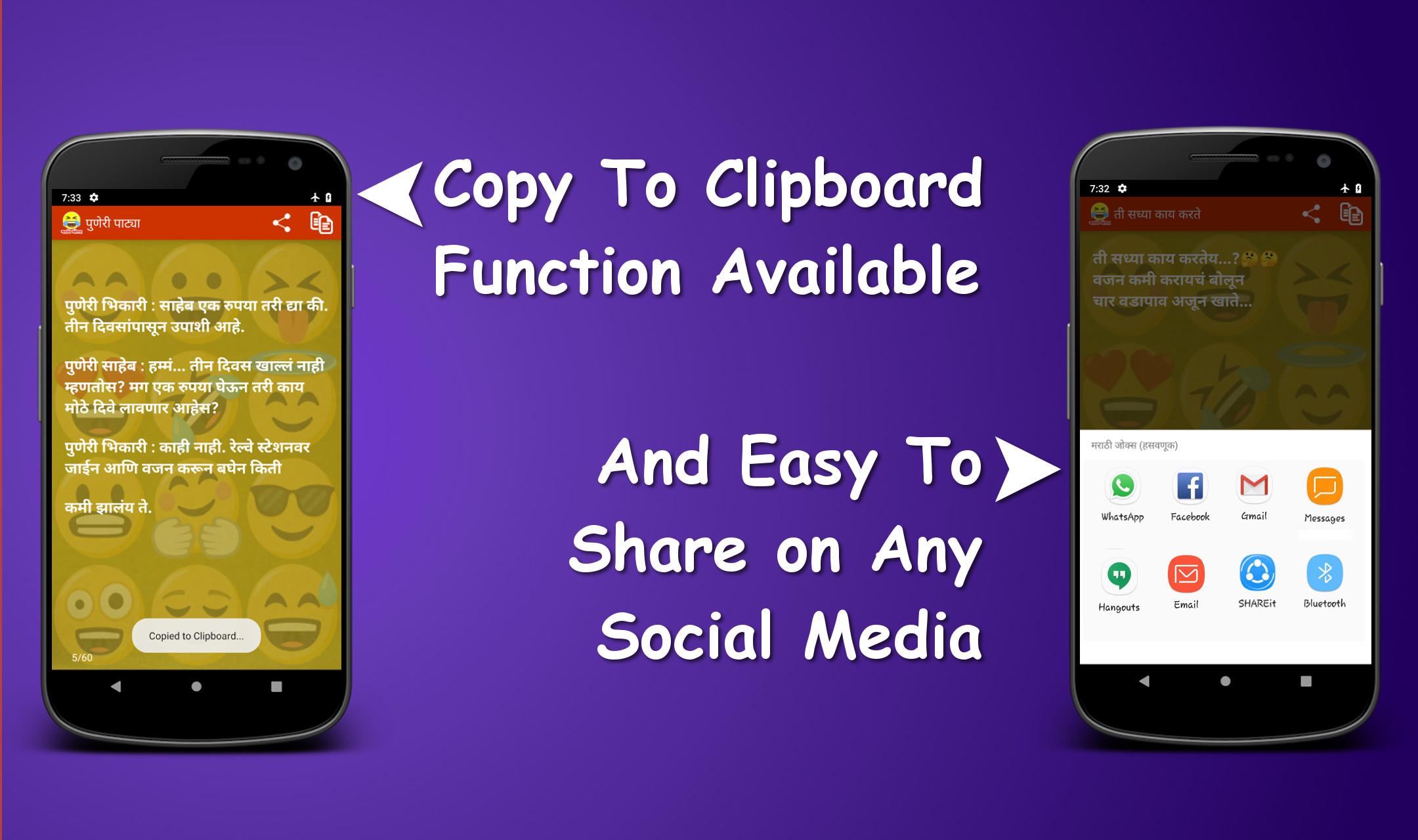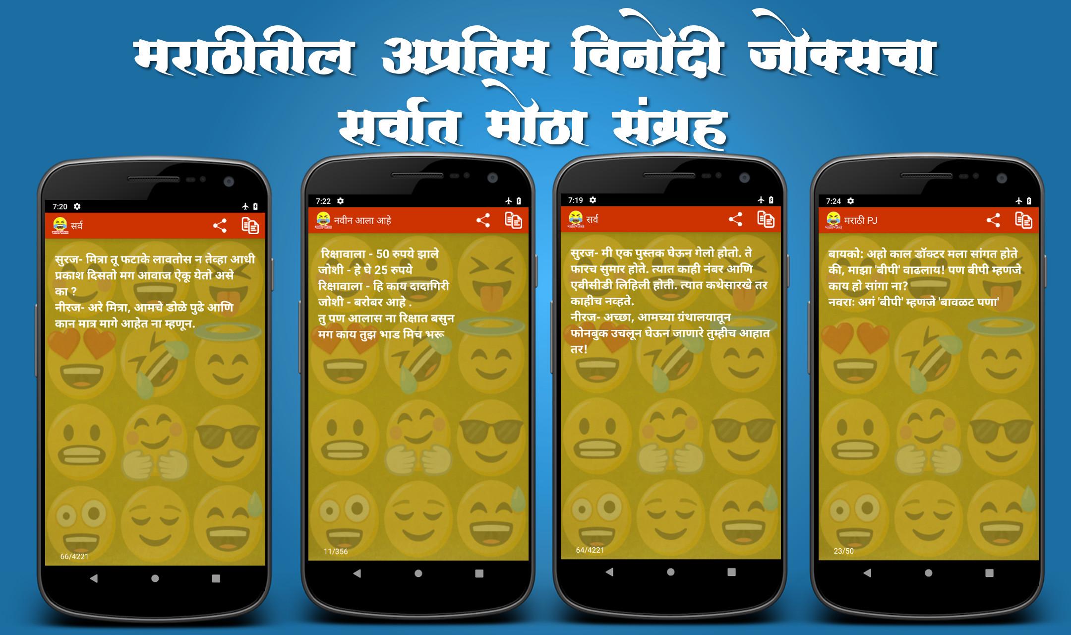 With more than 4000+ messages it contains the largest collection of Marathi jokes. Along with this there are 45 different categories, which is as follows:
