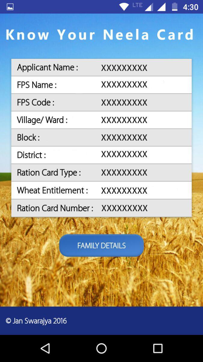 Purpose: The purpose of the mobile application is to provide support to the general public, especially the Atta Daal Scheme beneficiaries, by giving them easy access to their Ration Card data i.e. family details, fair price shop attachment and wheat entitlement, thus, empowering the beneficiaries and bringing in complete transparency in Public Distribution System through the application.
