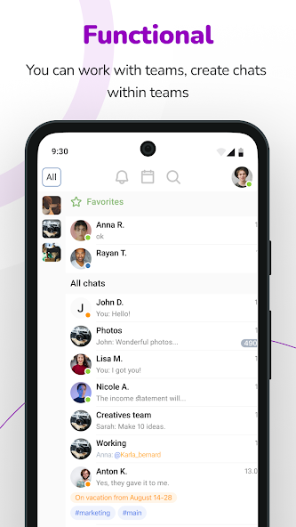 Shared workspace, for chats/files and groups. Manage members within a team. Create groups of participants for important and quick mentions. Create chats within the team. These chats will exclusively be available to team members only.