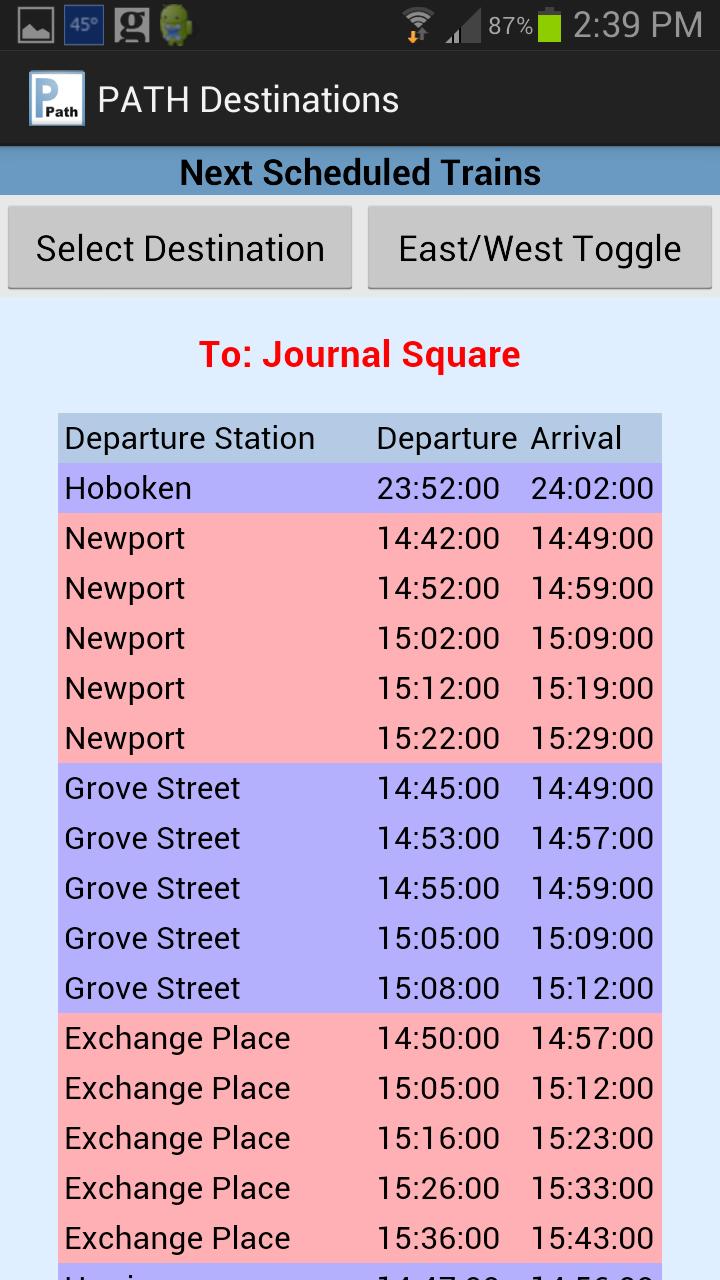 This app gives you the next scheduled departure times from all Path stations for trains going to your destination. The app lists the times for the next 5 trains to your destination from New York or New Jersey. Once you have specified your destination from the 13 stops in the Port Authority Trans Hudson rail network, the app lists the departure times for the next trains from the other stops. The weekday, weekend, and holiday schedules are stored on your phone, so it works underground.