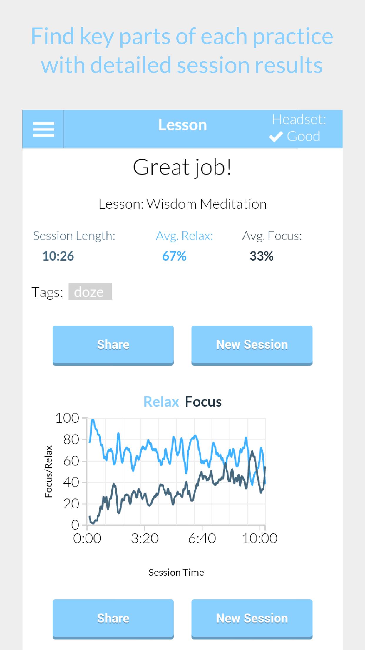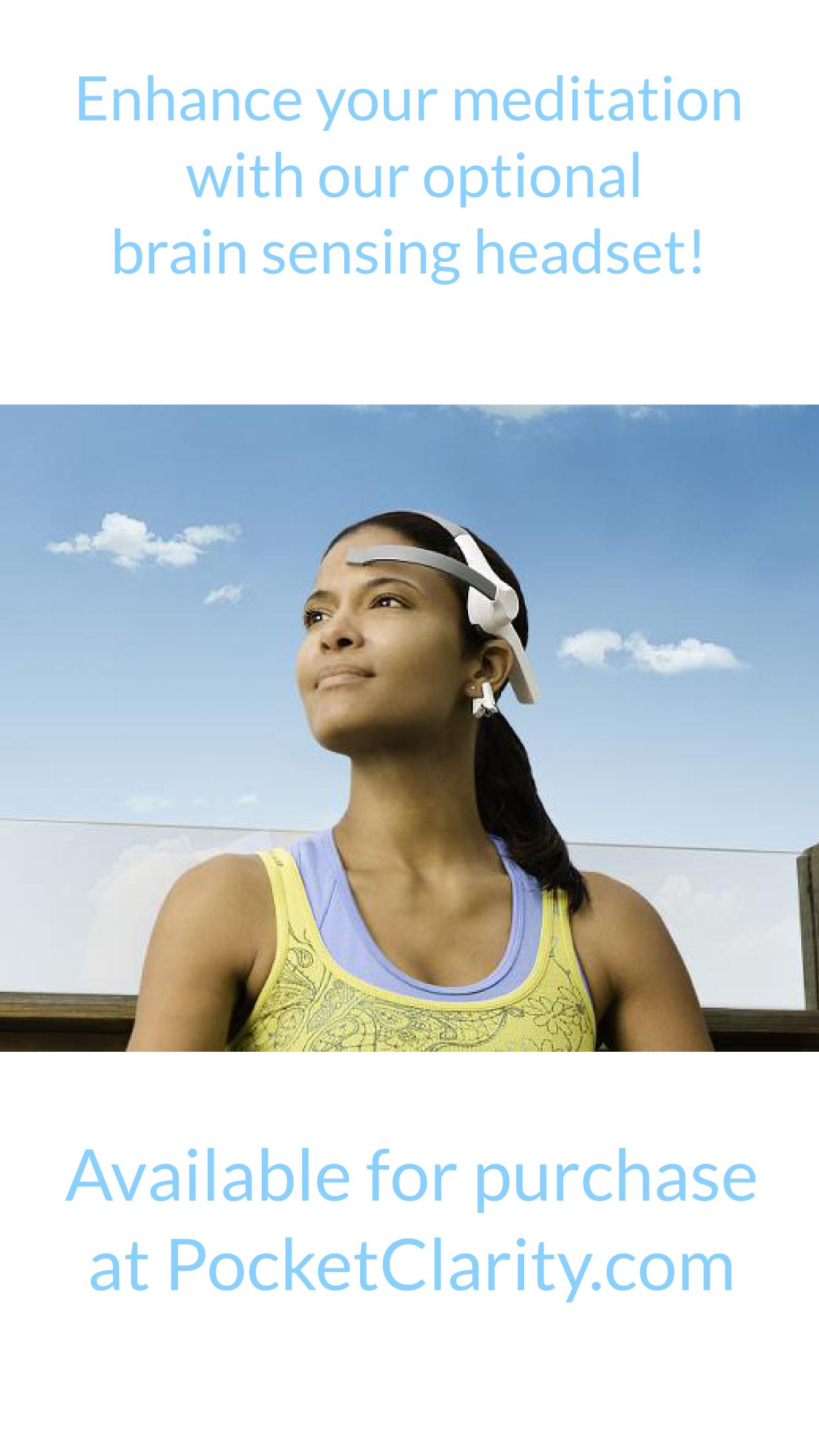 Try Pocket Clarity, a system that pairs mindfulness meditation exercises with a brainwave sensing headset to show you your mental states in real time. With a compatible headset, you see your level of relaxation and focus throughout each session. Gain deeper insight into how your mind is reacting and take your practice to a new level!