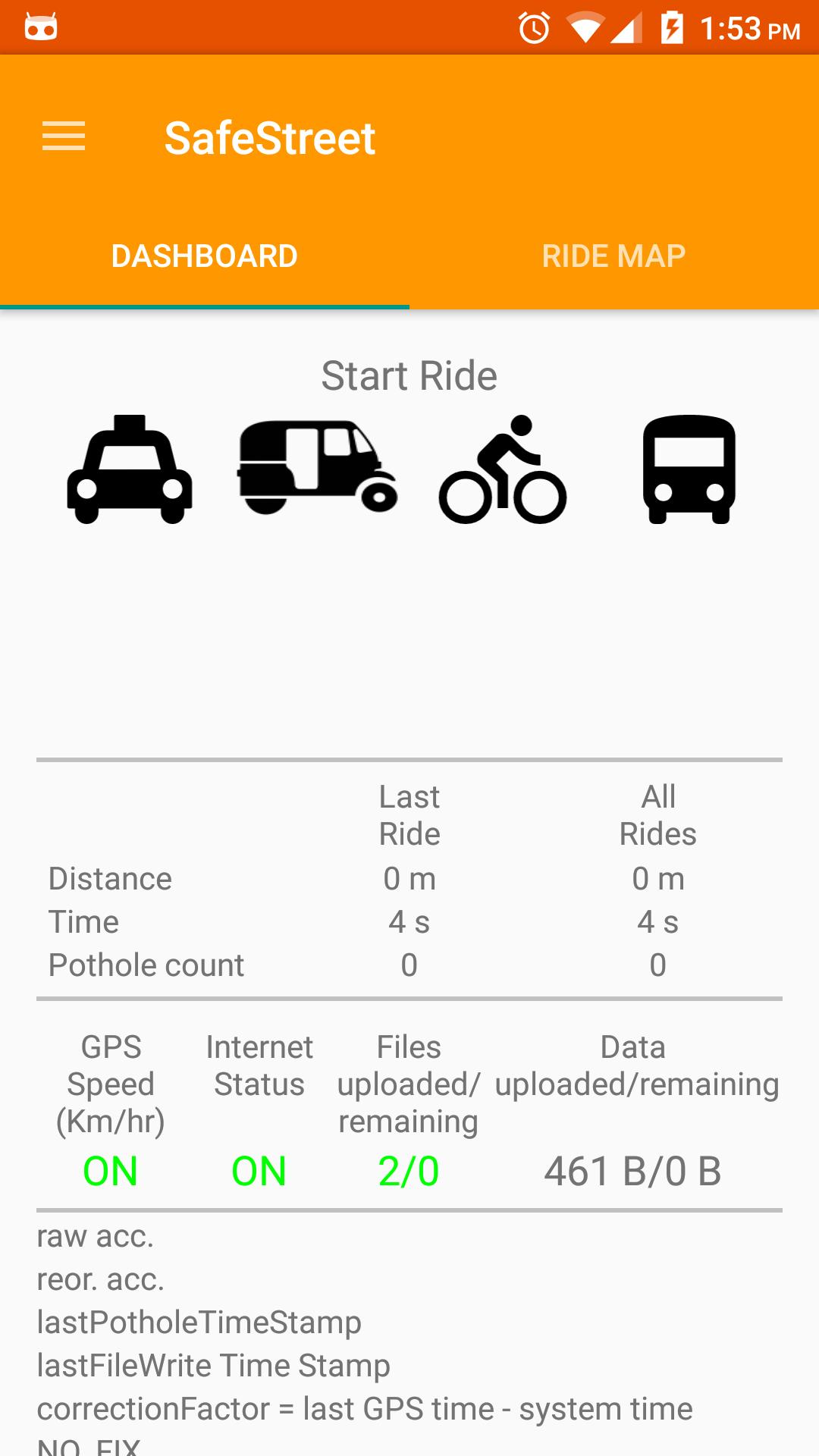 - For automatic detection, when travelling on the city roads, 'Start ride' by clicking on your respective vehicle and then 'stop ride' once you reach the destination (This uses mathematical algorithms to detect potholes/bumps and GPS to get the location of that pothole/bump)