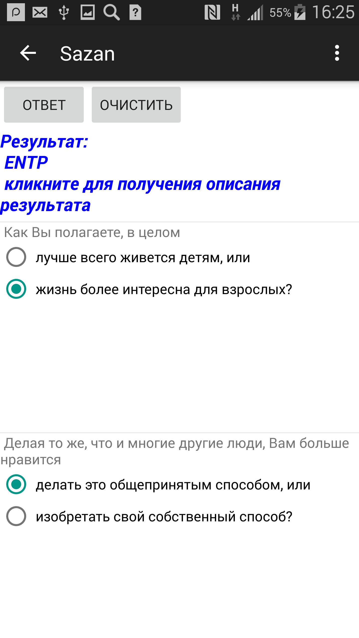 The application also contains tests for determining the Jung types (Myers - Briggs (MBTI) of socionics).
