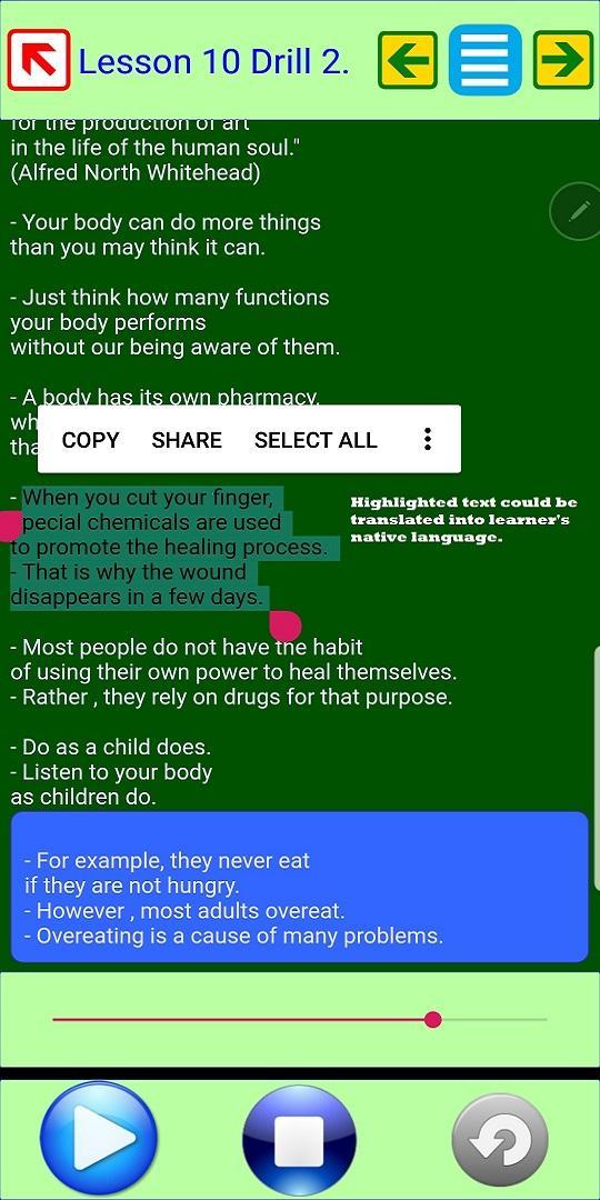 To ensure Subconscious Training English skills, an adult learner should perform simultaneously three activities - reading, listening, and speaking. This patented solution was never used for learning languages before. The app incorporates the support in a native language organized to eliminate cross-translating incoming information into the native language. Support in native languages is provided through Google Translate. The Android application could be used in the classroom, after the class is over, online and offline, self-study or guided learning, basically anywhere anytime.