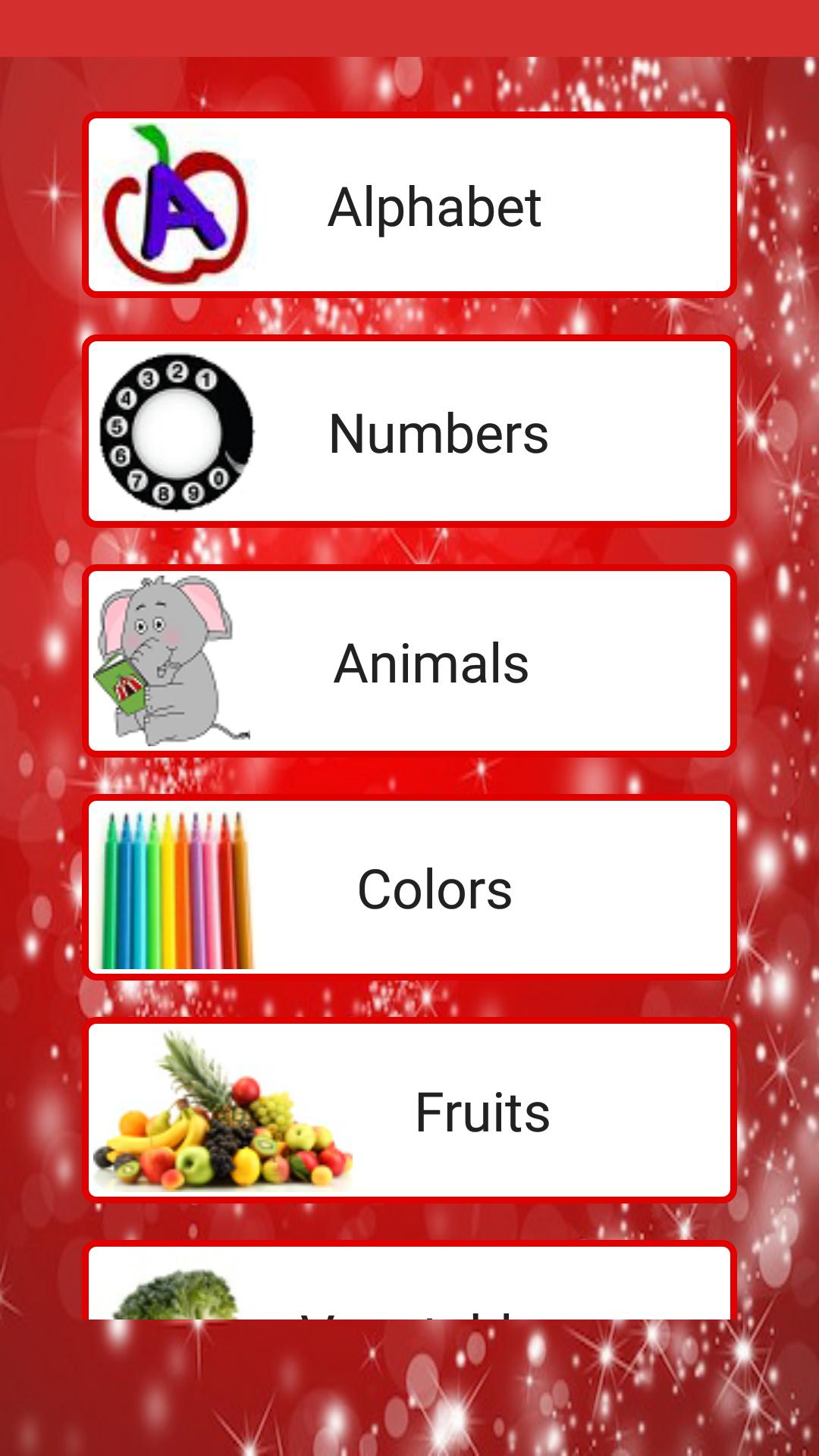 This Pictures book app helps toddler/preschool kids learn about Alphabets, Numbers, Shapes,Colors, Animals, Birds, Fruits,Flowers, Insects and Vegetables all in one app.