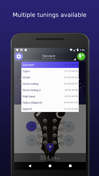 With this app you'll immediately get access to 8 different tunings for your mandolin, including standard tuning, open G tuning, cross tunings and more.