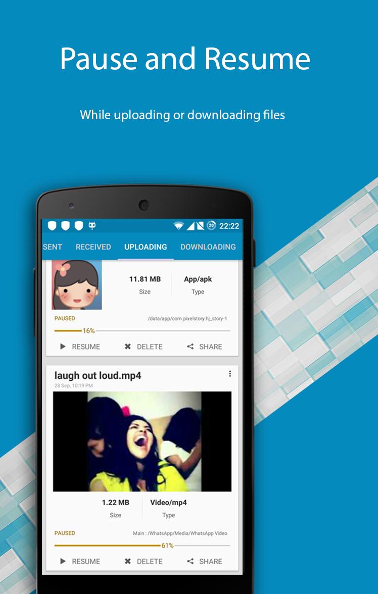 ☆ Pausing/Resuming: Uploading and downloading can be paused as well as resumed. In case of a network failure, you will be able to resume the upload/download without losing the current progress.