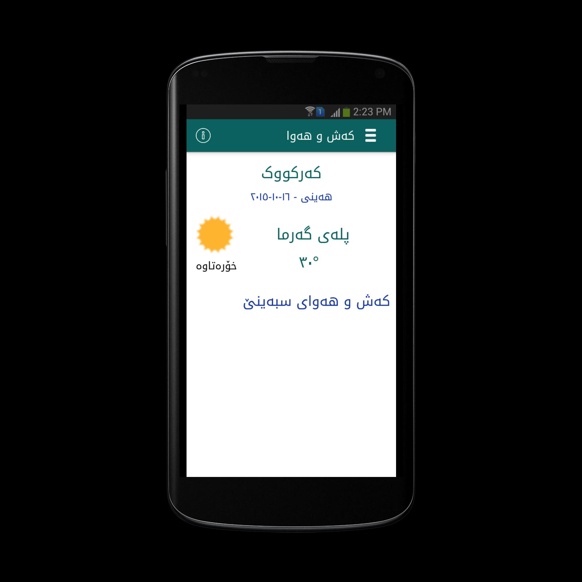التطبيق الأول باللغة الكردية الحلوة التي يجب أن تكون على دراية بالطقس في المدن الكردية ذات سطح بسيط وجميل ، من خلال هذا التطبيق ، يمكنك أن تكون على دراية بدرجة الحرارة بطريقة مفصلة وموثوقة يتم تجديد إحصائيات الطقس كل ساعة. يتم الحصول على معلوماتنا من عدة مصادر ومعاهد في المناخ العالمي.