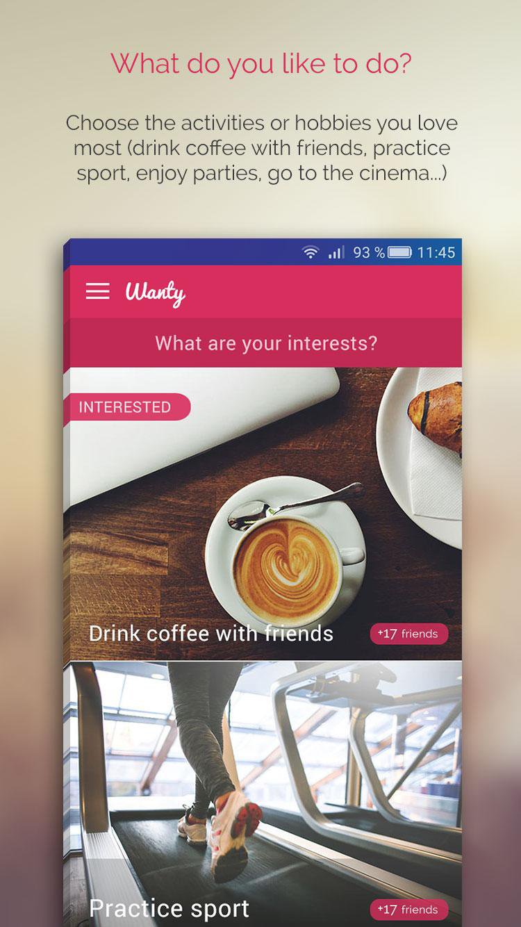 Wanty هو تطبيق لتبادل الخبرات، مثل الذهاب إلى السينما، أو تناول شيء ما، أو الاحتفال، أو شرب القهوة، أو ممارسة الرياضة... مع أشخاص لا تعرفهم! وهو مجاني 100%!