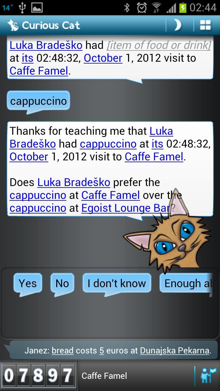 Curious Cat ist eine KI, die lernen möchte, Ihr Leben besser zu machen. Sie und Ihre Freunde beantworten seine Fragen zu Ihrer Welt; Es verwendet das, was es lernt, zu versuchen, bessere Orte zu finden und Dinge zu tun. Es wird nicht nur ein Café vorschlagen - es wird eine spielen, die die Musik spielt, die Sie mögen, und serviert einen großartigen Karottenkuchen (einer Ihrer Favoriten).
