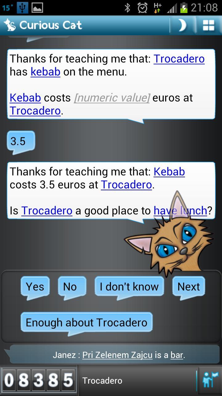 Die KI hinter Curious Cat versucht zu verstehen, was Sie ihm sagen, und sie in eine wachsende Wissensbasis zu integrieren. Es begründet, was sich in dieser Wissensbasis befindet, um zu entscheiden, was zu fragen ist und was Sie vorschlagen sollen, und es wird die Ergebnisse dieser Argumentation ins Englische, um mit Ihnen zu kommunizieren. Da es sich um Alpha handelt, können Sie manchmal einige davon sehen. Denken Sie daran, dass Curious Cat schlauer und fähiger wird, aber es ist immer noch Alpha: Genau wie unsere KI möchten wir, dass Ihr Feedback Curious Cat zum besten, klügsten Begleiter und Assistenten macht, den es sein kann.