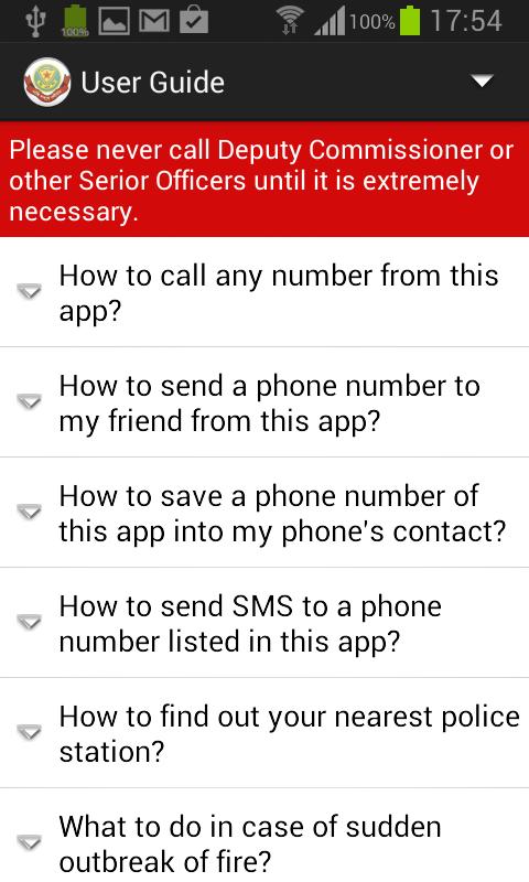 2. Wenn Sie sich mit einem Problem wie Feuerausbruch, persönlicher Sicherheit oder Straßenunfall befassen, rufen Sie einfach mit einem einzigen Klick aus der App zur nächsten Polizeistation an. Keine Auswendigart oder Speichern von Nummer in Telefonbuch.