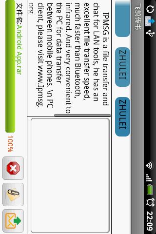 Ipmsg ist eine Dateiübertragung und ein Chat für LAN -Tools. Er hat eine hervorragende Dateiübertragungsgeschwindigkeit, die viel schneller als Bluetooth, Infrarot. Und sehr bequem zum PC für die Datenübertragung zwischen Mobiltelefonen.pc -Client, besuchen Sie bitte www. Ipmsg .org