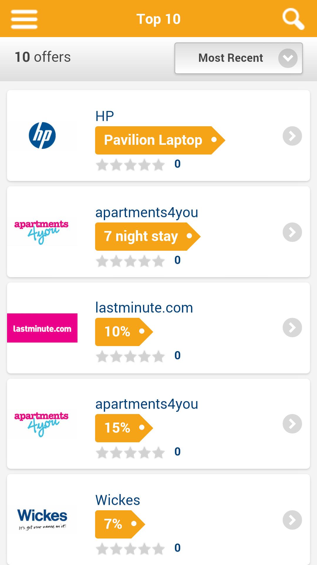 Wenn Sie sich im ersten Bildschirm anmelden, sind die 10 zuletzt hinzugefügten Angebote. Sie können dies sofort in die zehn beliebtesten Angebote ändern, die am höchsten bewertet, trendig oder AZ.