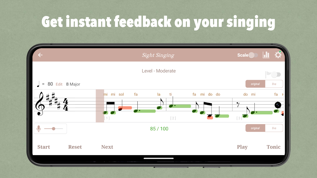 • Analysieren Sie die Tonhöhe, die Sie für jede Note singen, und erhalten Sie sofortiges Feedback zu seiner Genauigkeit.