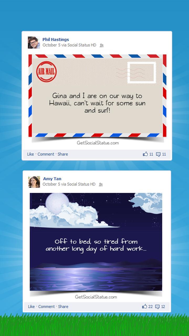 Erwarten Sie Ihre Facebook -Beiträge zum Leben! Der soziale Status verwandelt Ihre langweiligen Facebook-Beiträge nur für Text in atemberaubende Bilder und bringen Sie mehr Likes, Kommentare und Shares.