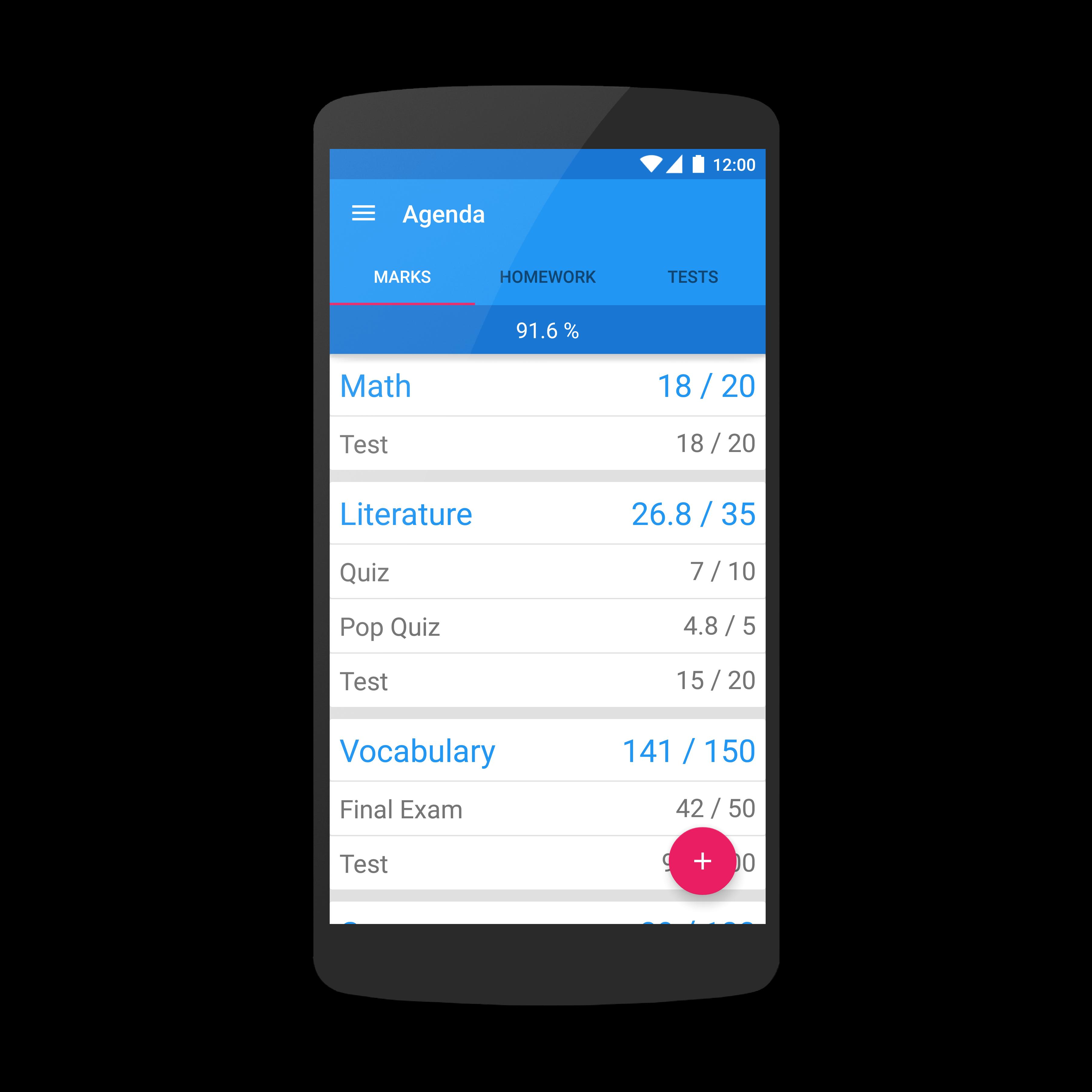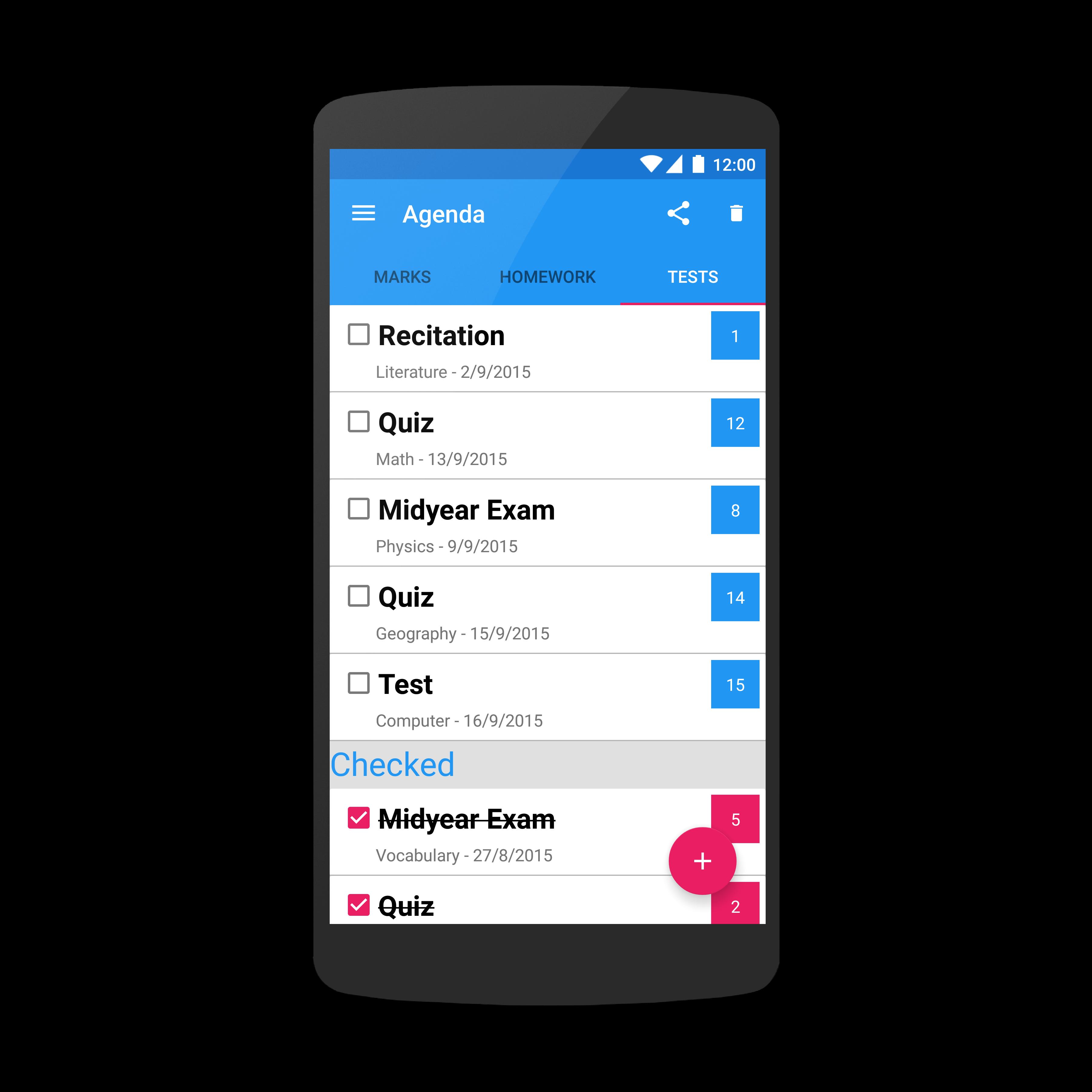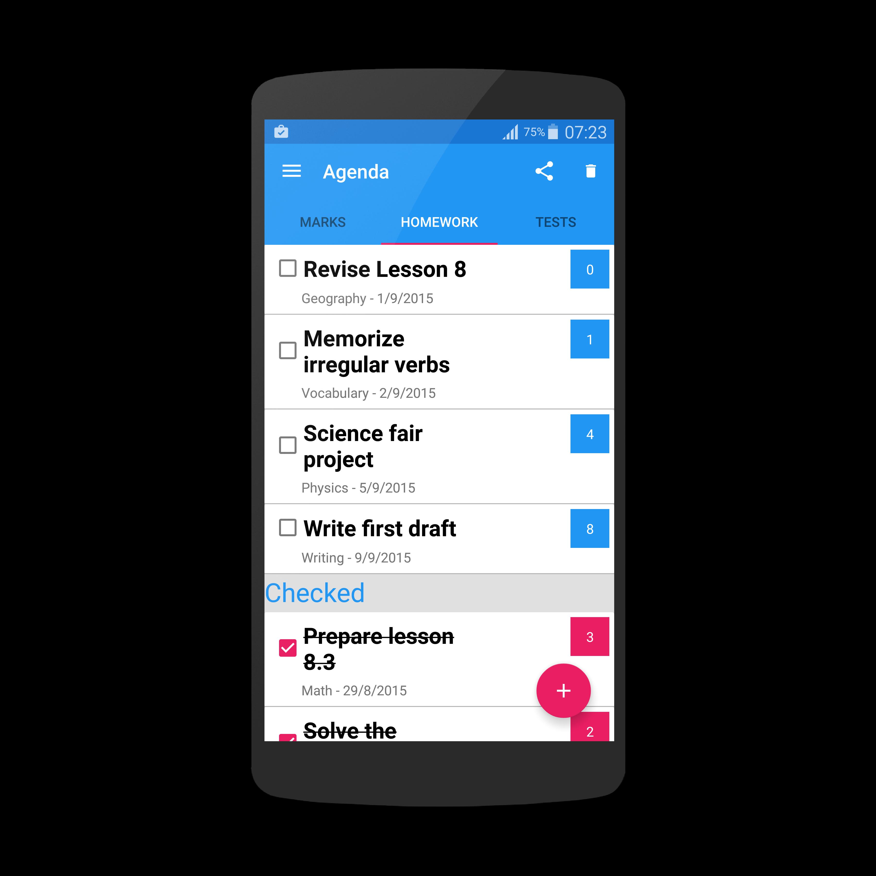 Ein Studienorganisator, der jede Marke sparen kann, die Sie erhalten, benachrichtigt Sie für jede Hausaufgaben und die bevorstehende Prüfung. Ein intelligenter, organisierter Studienweg!