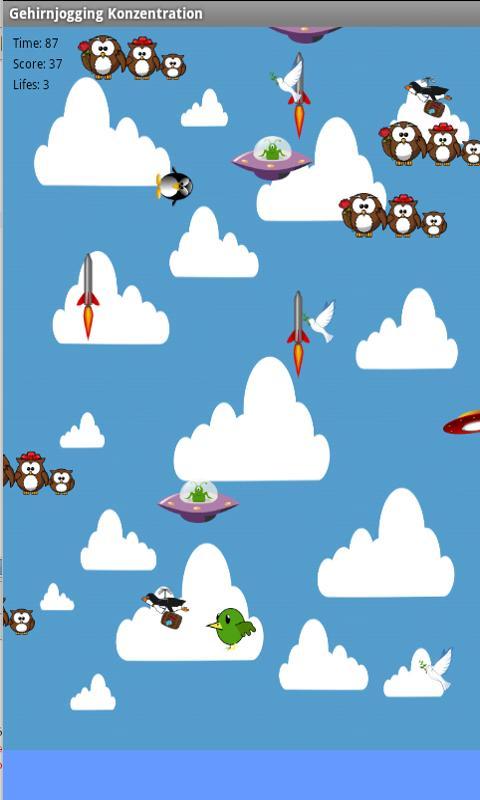 Versuchen Sie, so viele Vögel und UFOs wie möglich zu berühren. Sie erhalten einen Punkt für jedes Objekt. Wenn Sie 120 Punkte erreichen, gewinnen Sie.