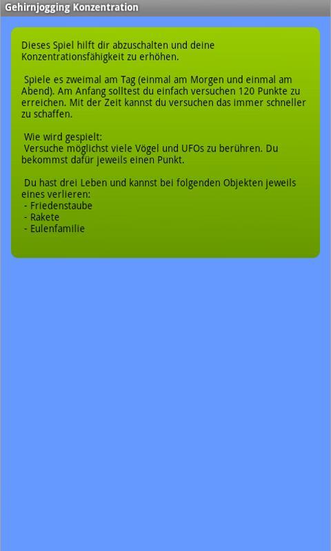 Brain Calisthenics hilft Ihnen, Ihren Geist zu klären und zu trainieren und Ihre Konzentration zu verbessern. Spielen Sie es zweimal am Tag (morgens und am Nachmittag).