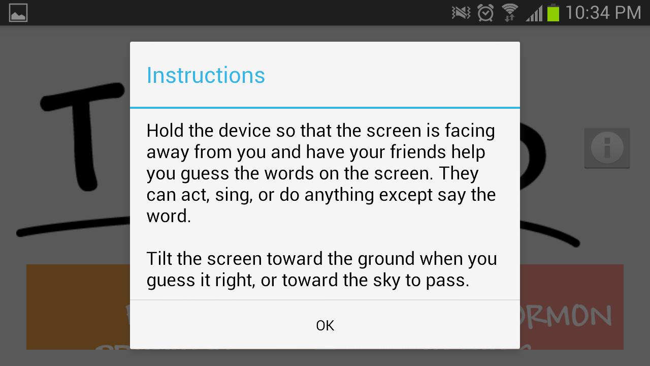 Sie halten das Gerät so, dass der Bildschirm von Ihnen weggeführt wird und Ihre Freunde Ihnen helfen, die Wörter auf dem Bildschirm zu erraten. Sie können handeln, singen oder alles tun, außer das Wort zu sagen. Neigen Sie den Bildschirm in Richtung Boden, wenn Sie ihn richtig oder zum Himmel erraten, um zu passieren.
