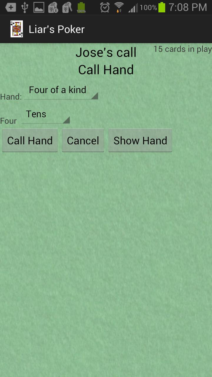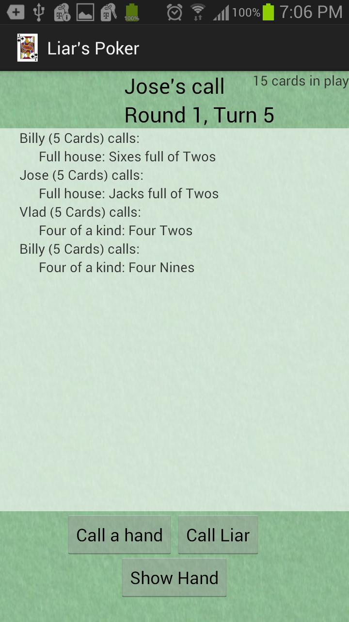 Zu Beginn jeder Runde werden den Spielern eine Hand mit Karten gehandelt. Jede ausgehandelte Karte wird im Spiel berücksichtigt und kann verwendet werden, um die genannten Pokerhände zu bilden. Wenn Lügner gerufen wird, werden alle Karten bekannt gegeben, und wenn die Hand in der Kartenbecken existiert, verliert der Spieler, der Lügner angerufen hat, in der nächsten Runde eine Karte. Das Gegenteil ist wahr, wenn die Hand im Kartenpool nicht vorhanden ist, dh der Spieler, der die Hand angerufen hat, verliert eine Karte, wenn Karten erneut behandelt werden. Dies geht weiter, bis nur eine Person mit Karten in der Hand ist und dieser Spieler zum Sieger erklärt wird.