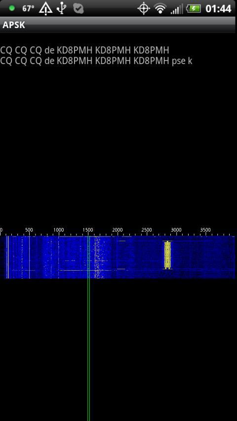 Esta aplicación recibe BPSK31 a través del micrófono y muestra el texto recibido en la pantalla. Probablemente no funcionará en absoluto sin un procesador bastante rápido. Además, la cascada aún no se alinea bien.