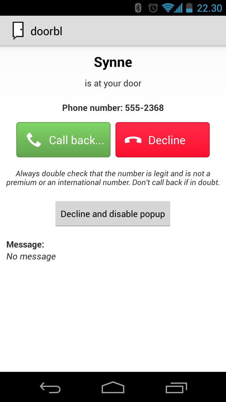 Al aprovechar NFC (comunicación de campo cercano), los códigos QR (códigos de respuesta rápida) y el hecho de que todos llevan su dispositivo móvil, ahora puede responder a la puerta incluso cuando no está en casa o no puede venir a la puerta. Este es el timbre del futuro.