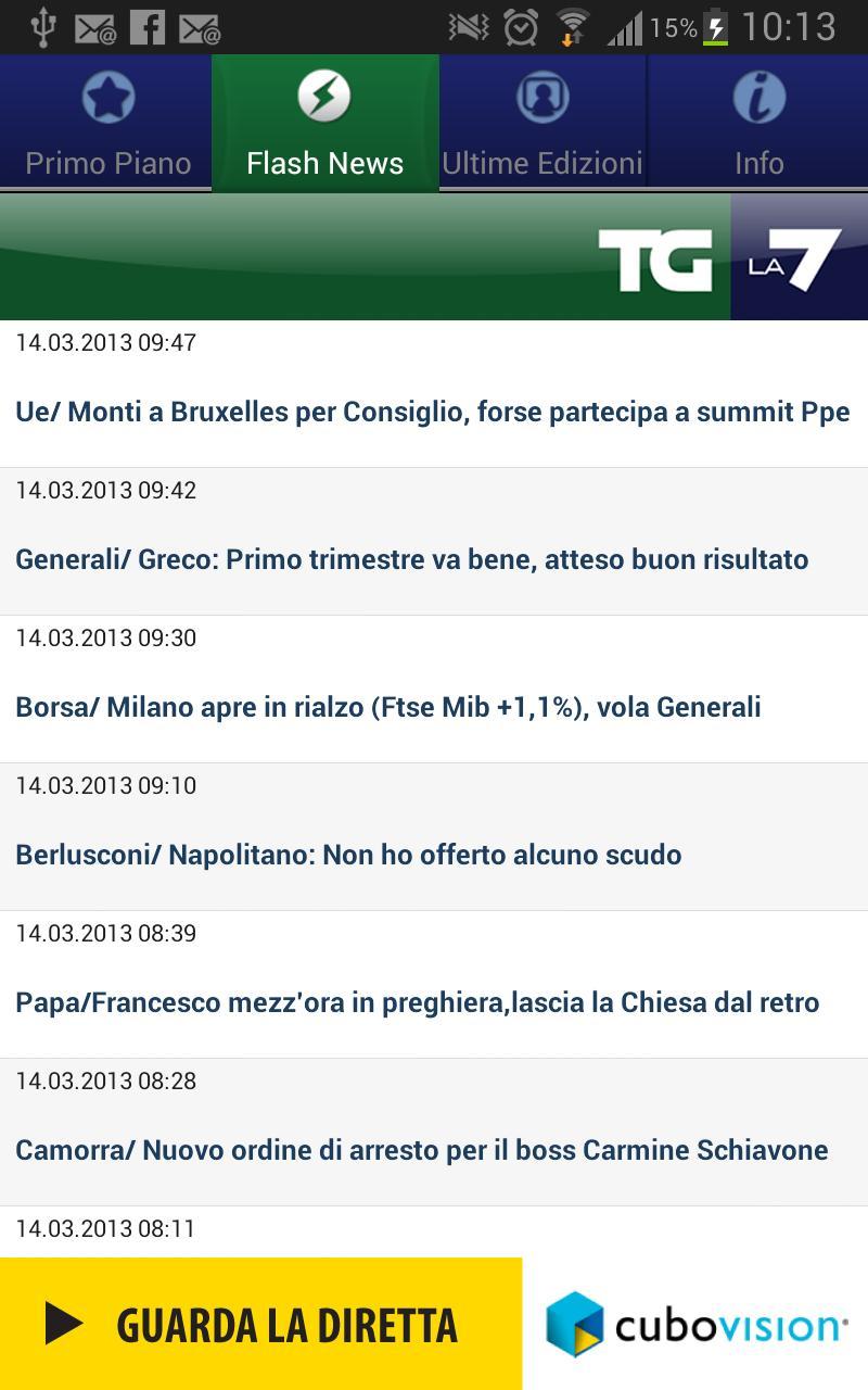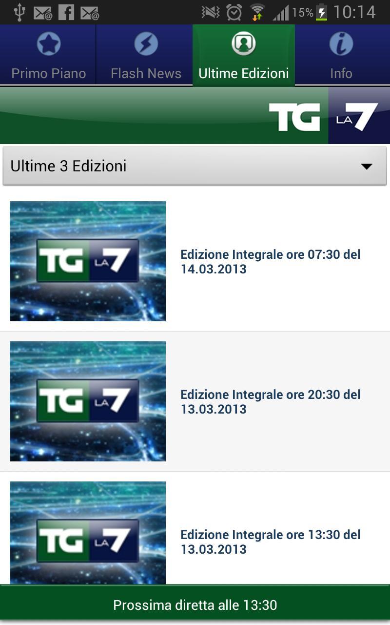 La información del TG LA7 dirigida por Enrico Mentana es gratuita. Con la aplicación TG La7 Mobile siempre puede estar informado y acceder directamente desde su teléfono inteligente hasta las siguientes secciones: