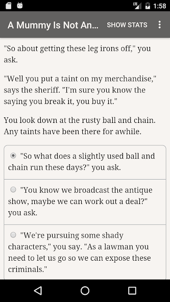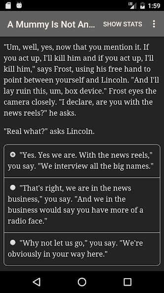 " A Mummy Is Not An Antique " es una novela interactiva de 52,000 palabras de Randy Condon, donde sus elecciones controlan la historia. Está completamente basado en texto, sin gráficos o efectos de sonido, y alimentado por la vasta e imparable poder de su imaginación.