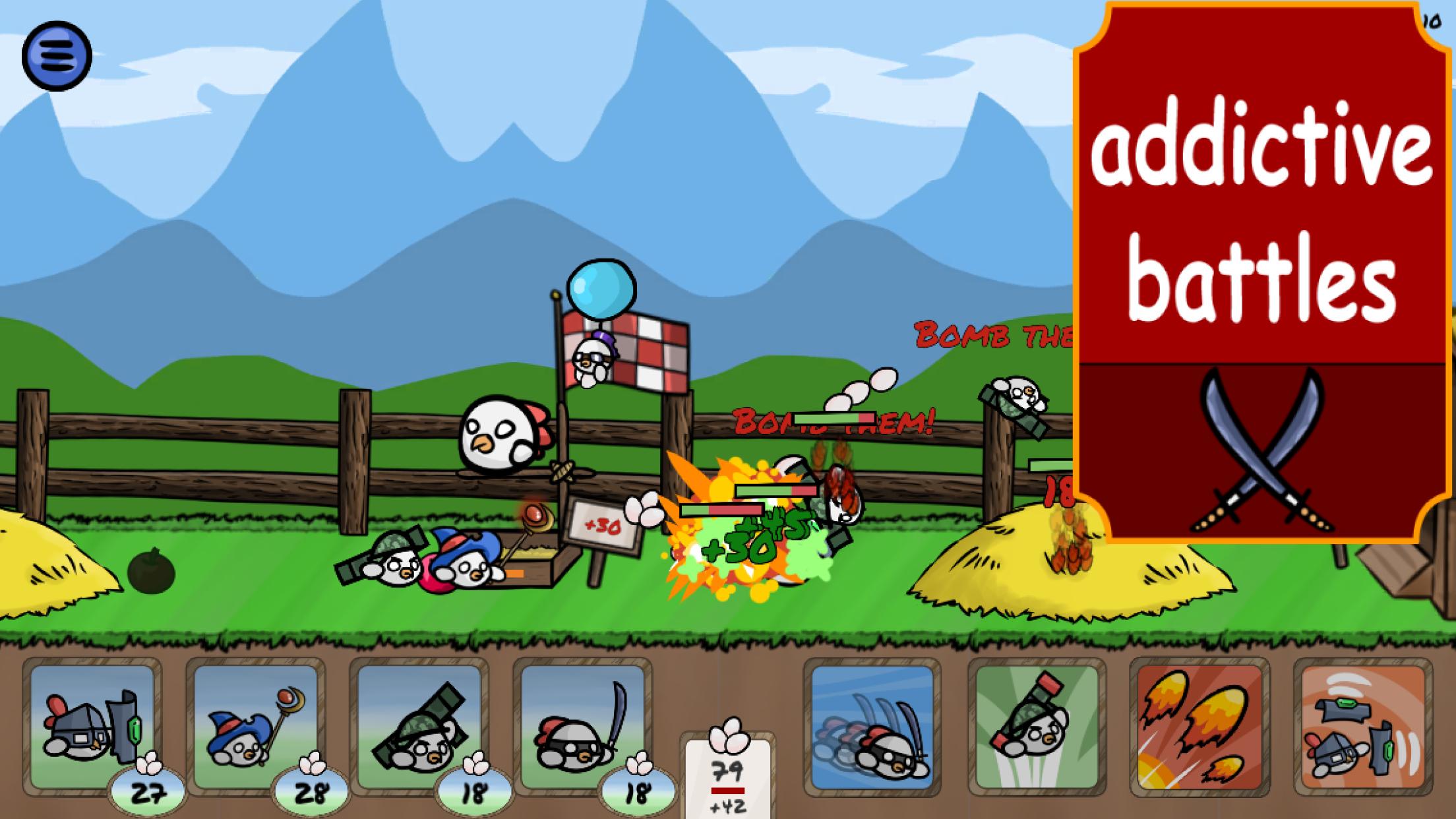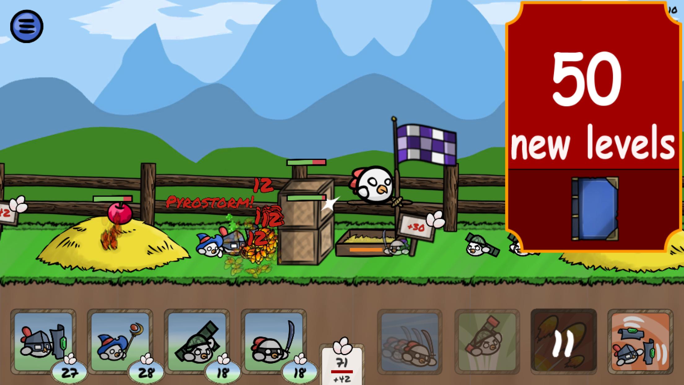 Juega a un Hungry Chicks completamente nuevo con 50 nuevos niveles y 150 nuevos desafíos. ¡Experimenta el Hungry Chicks como nunca antes con esta gran actualización y obtenga una experiencia de juego única entre las montañas, prados y granjas idílicas! Pero ten en cuenta que el enemigo ha usado el tiempo intermedio para reunirse y ha convocado a sus generales, ¡quienes deben ser derrotados en emocionantes batallas de jefes para completar un capítulo! Sin embargo, tus unidades también han entrenado y ahora tienen nuevas habilidades que se obtienen durante todo el juego y te dan ventajas en luchar contra tus oponentes. Al matar enemigos, tus polluelos ganan niveles veteranos y se vuelven cada vez más fuertes a medida que se dirigen al establo del enemigo hasta que ningún enemigo pueda detenerlos. ¡Las potencias curativas caídas por enemigos derrotados y la torre de alimentación rediseñada también te ayudará a seguir este camino y llevar tus unidades a su destino!