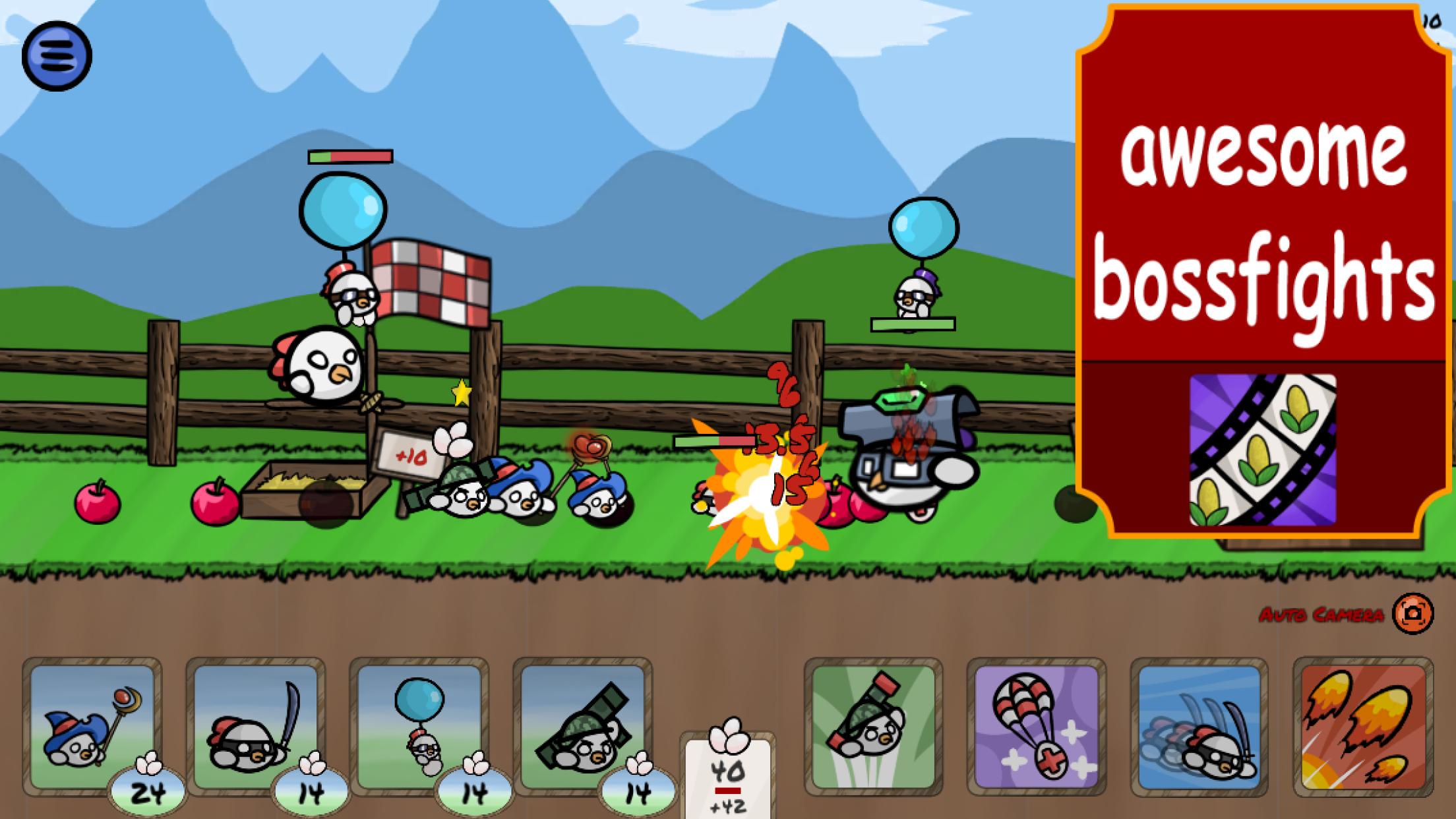 Para hacer que la lucha contra los ladrones de alimentos sea aún más agradable, también hemos agregado muchas mejoras gráficas, como nuevas explosiones, pollos parlantes, nuevos efectos de sonido y animaciones, una mejor interfaz de usuario y un menú más intuitivo, mejor combate, comida y mecánica redonda y mucho más.