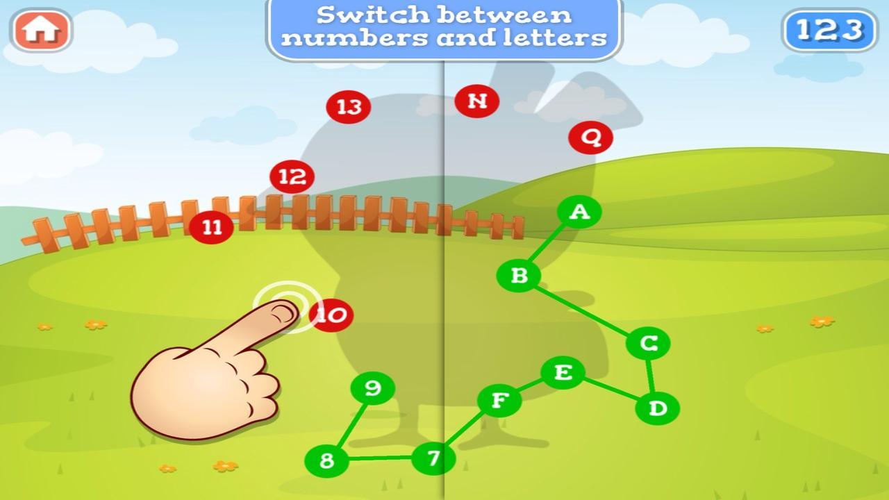 La interfaz de juego DOT a DOT (conectar los puntos) es amigable para los niños y no sobrecarga a su hijo con demasiados estímulos. El juego ayuda a reconocer formas y a mejorar las habilidades motoras finas de su hijo. Al tocar los pequeños puntos uno tras otro, el orden de las letras en el alfabeto se puede aprender y reconocer paso a paso.
