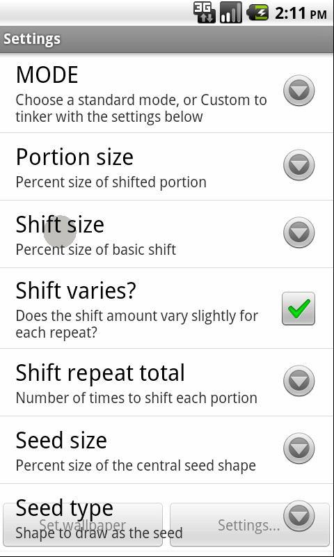Este fondo de pantalla en vivo hace hermosas formas y texturas orgánicas de cambio hipnótico. Es como una lámpara de lava fractal. Puede entrar en la configuración para cambiar el modo (nube, tela o ágata) o inventar su propio modo jugando con los parámetros.