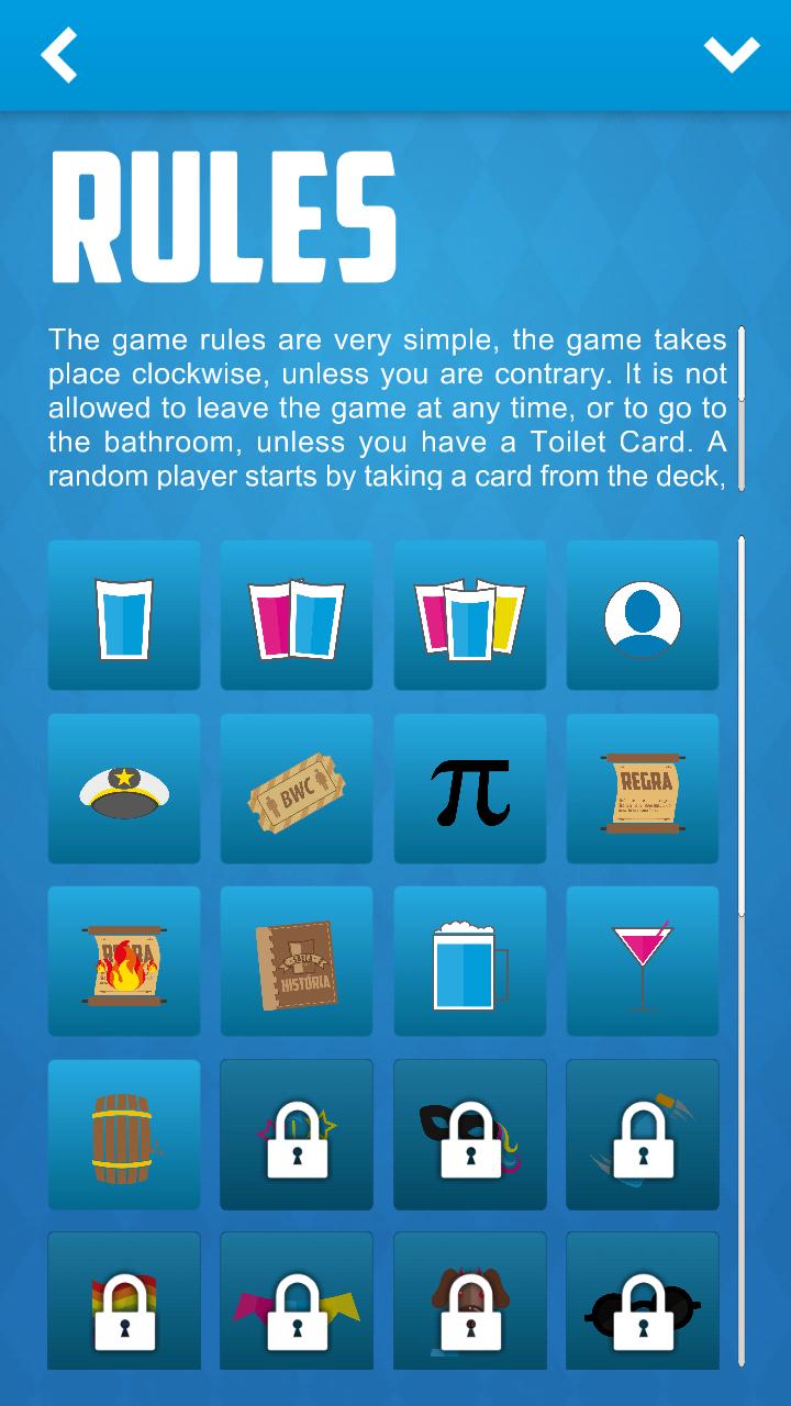 Las reglas del juego son muy simples, el juego tiene lugar en el sentido de las agujas del reloj, a menos que seas al contrario. No se le permite abandonar el juego en ningún momento, o ir al baño, a menos que tenga un baño de letras. Un jugador aleatorio comienza tomando una carta del mazo, cada carta tiene un significado y una acción diferente, el total son trece cartas, que forman el mazo básico. También puede personalizar su propio mazo, utilizando las cartas básicas y otras compradas en la tienda. Alrededor de la carta, el jugador debe cumplir la acción escrita en ella. En caso de retiros, el botón debe presionarse y el castigo debe cumplirse.