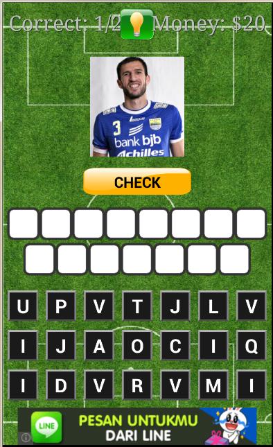 Este juego contiene fotos de Persib Bandung Players, adivina el nombre del jugador compilando letras aleatorias debajo de la foto correcta.
