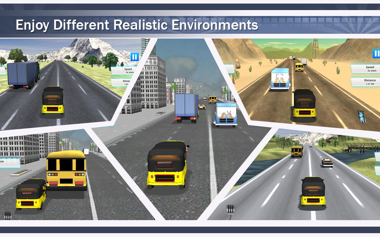 1. El juego de rickshaw de autopista proporciona un simulador 3D del tráfico de carreteras. Conduce el Auto Rickshaw en una carretera Crowdy. Pon a prueba tus habilidades de carreras de carreteras con dirección y acelerador. Manténgase alejado de los autos y camiones que vienen en su dirección. Verifique su puntaje mientras limpia los niveles en el marcador.