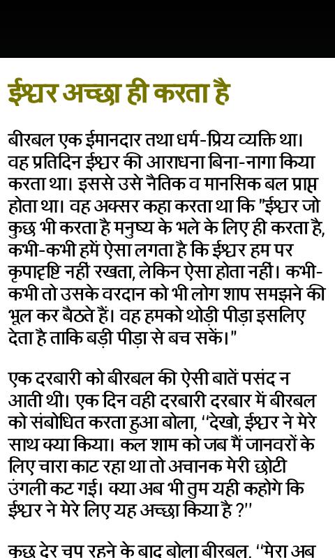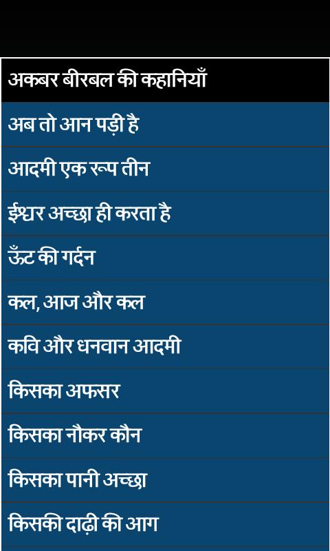 Ram, Bhartiya Lok Kathaye etc. Cette application est comme une bande dessinée. Chaque personne peut profiter d'histoires en hindi avec résumé. Vous pouvez également enseigner les leçons à votre enfant en leur disant Kahaniya d'Akhbar & Birbal en hindi. Bribal est une personne intelligente très célèbre et il fait partie de Nav Ratan d'Akhbar Darbar. Dans cette grande collection d'histoires, vous aurez un coup d'œil à la culture indienne traditionnelle. Le jeune y fera des souvenirs de temps vieux quand ils seront petits et demandent là-bas Daadi Maa pour raconter des histoires de fée et tout. Une riche collection de Kahaniya est dans le bout de votre doigt et dit maintenant aux autres. Cette application contient la collection de Tenali Raman Kahaniya (histoire), Panchtantra Kahaniya (histoire) etc. Alors soyez prêt à raconter une histoire douce à votre enfant dans la nuit où vous dites bonne nuit à tout le monde. Cette application vous aide à être avec vos enfants de votre temps chargé et à les rendre heureux avec des histoires populaires en hindi. Donnez-leur de bonnes histoires d'hindi d'enfance avec morale qui les aident à mieux vivre dans la vie future, c'est-à-dire que vous faites un bon citoyen pour votre pays.
